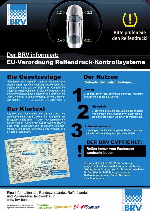 Laut EU-Verordnung 661/2009 müssen alle neuzugelassenen Fahrzeuge der Klasse M1 (PKW, Geländewagen, Wohnmobile) ab 1. November 2014 mit einem Luftdruck-Kontroll-System nach ECE-R 64 ausgestattet sein.